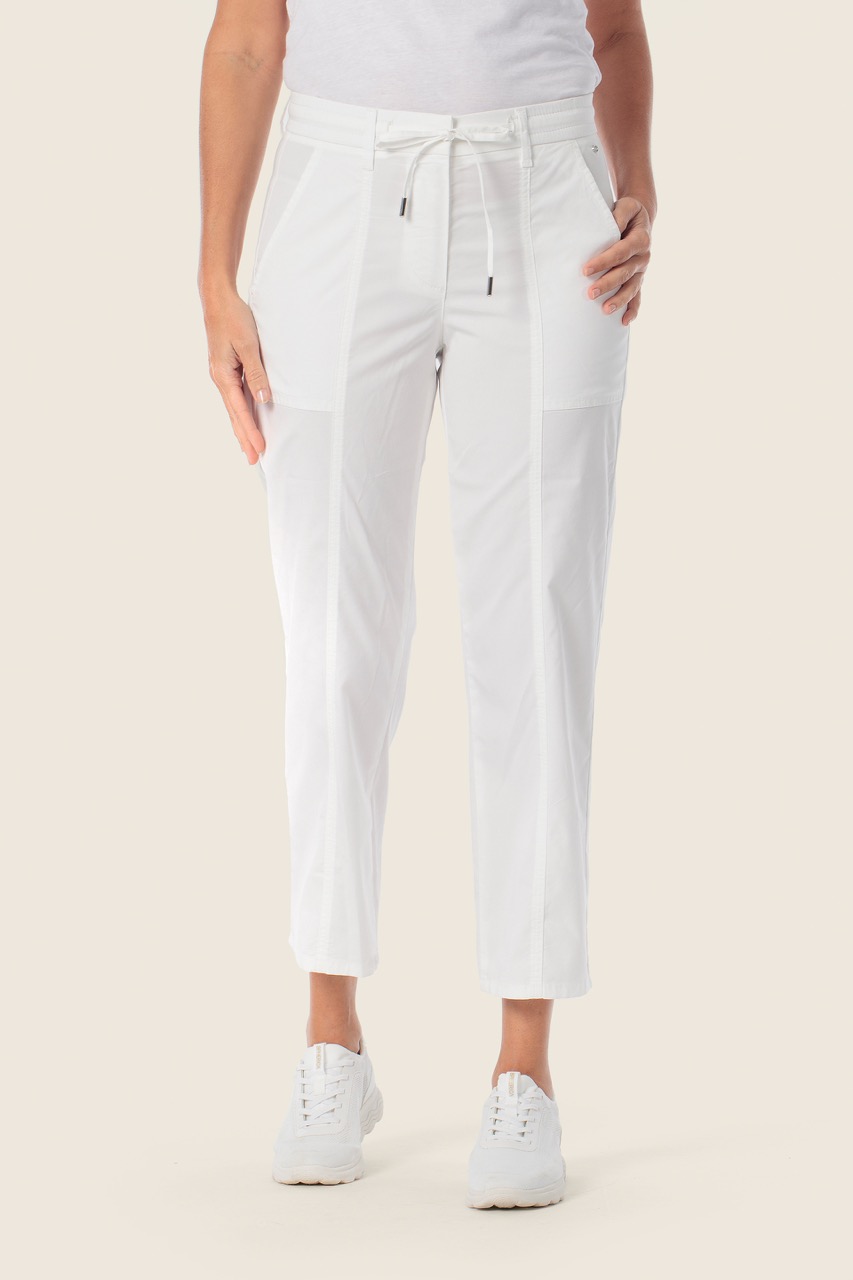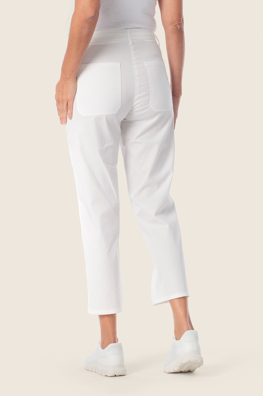 Spodnie wykonane są z lekkiego i komfortowego materiału, który dobrze układa się na sylwetce i sprawdza się szczególnie w cieplejszych miesiącach. Model utrzymany jest w klasycznym odcieniu bieli, co czyni go uniwersalną bazą do wielu stylizacji – od casualowych po bardziej eleganckie.