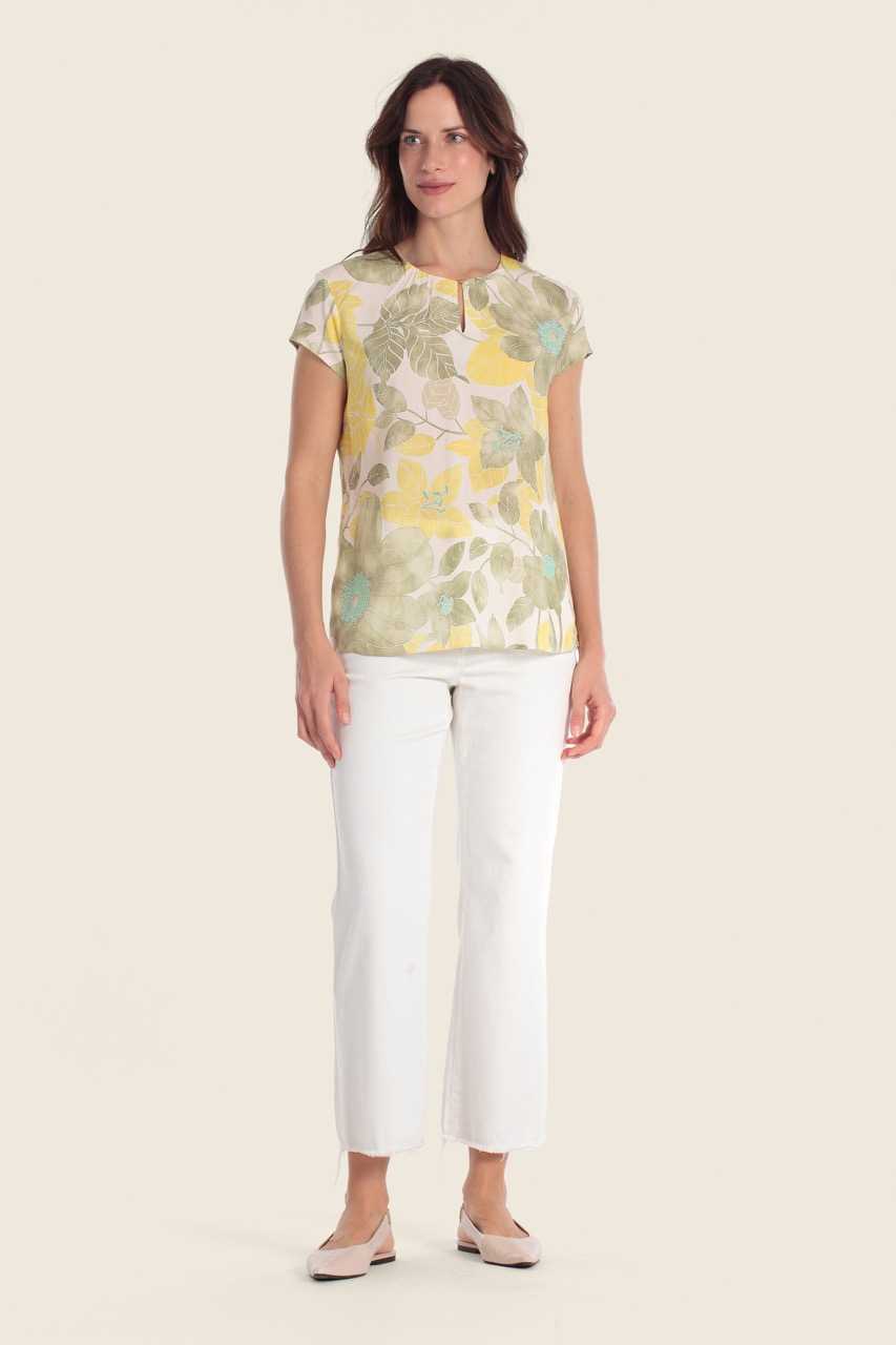 Bluzka damska Gerry Weber w subtelny, roślinny wzór to lekka i kobieca propozycja na sezon wiosna–lato. Wykonana z przewiewnej tkaniny, zapewnia komfort noszenia nawet w cieplejsze dni. Delikatny print w odcieniach żółci, zieleni i beżu nadaje jej świeżości i naturalnego charakteru. Krótki rękaw oraz niewielkie rozcięcie przy dekolcie dodają lekkości i elegancji. To idealna bluzka do codziennych stylizacji – świetnie komponuje się zarówno z jasnymi spodniami, jak i spódnicą.