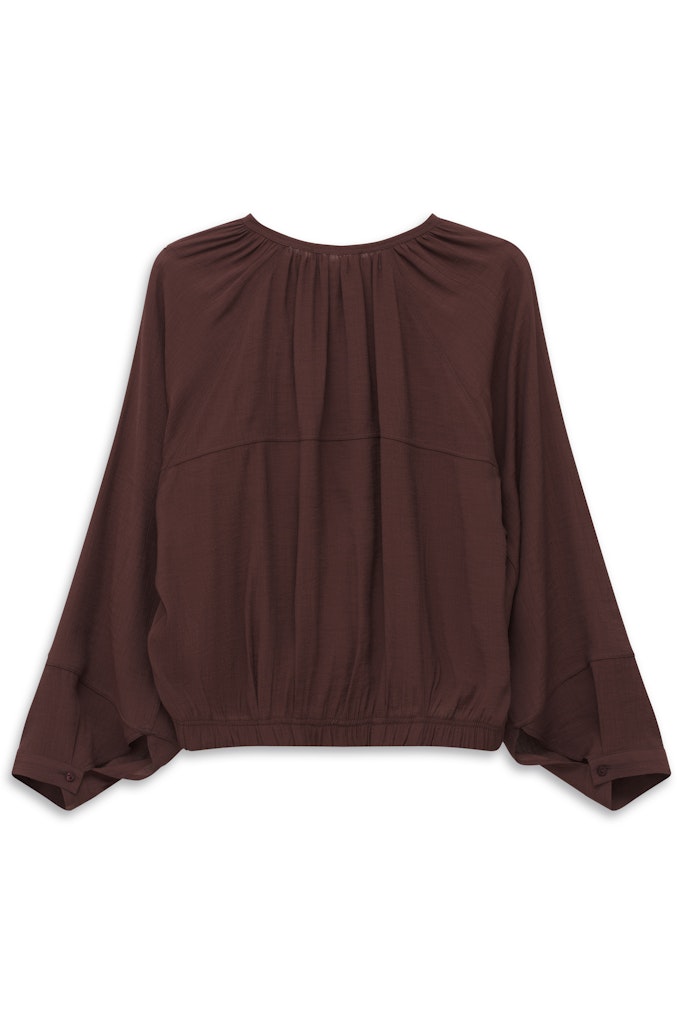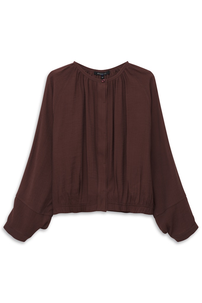 Bluzka damska bugatti w eleganckim, głębokim odcieniu bordo/brązu to stylowa propozycja na co dzień i na specjalne okazje. Model o luźniejszym kroju z delikatnym marszczeniem przy dekolcie dodaje lekkości i kobiecego charakteru. Długie rękawy zakończone szerokimi mankietami podkreślają nowoczesny styl. Elastyczne wykończenie u dołu sprawia, że bluzka dobrze układa się na sylwetce. Lekka, zwiewna tkanina zapewnia komfort noszenia przez cały dzień. Świetnie komponuje się zarówno ze spodniami, jak i spódnicami, tworząc eleganckie stylizacje.