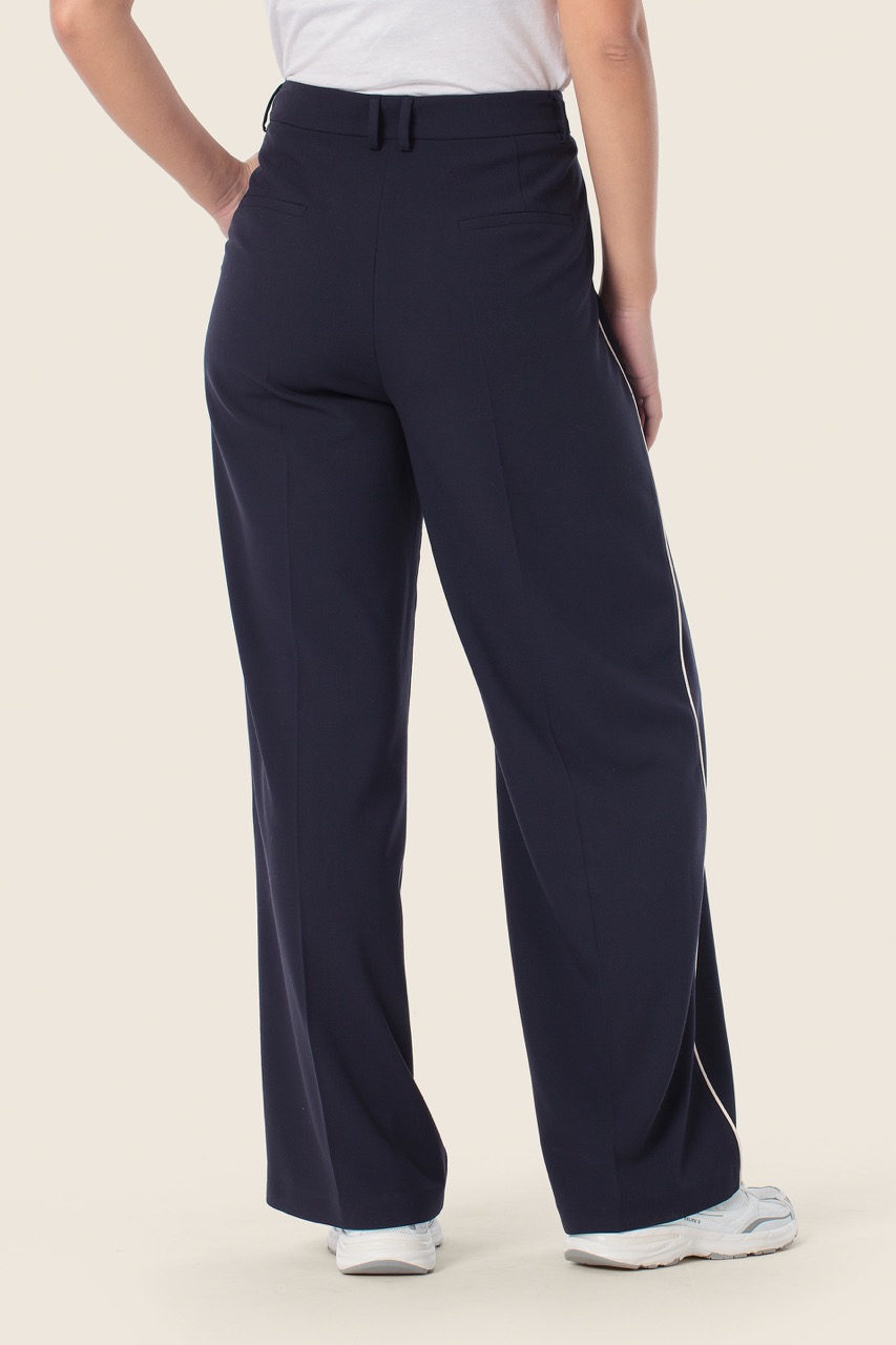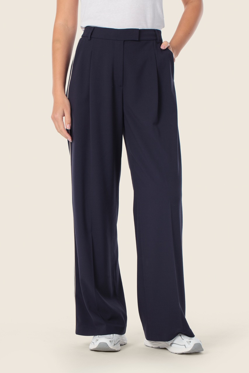 Spodnie posiadają wysoki stan, zapięcie z przodu oraz praktyczne kieszenie, dzięki czemu są funkcjonalne i komfortowe w codziennym noszeniu. Charakterystycznym elementem modelu jest subtelny lampas biegnący wzdłuż nogawki, który optycznie wydłuża sylwetkę i dodaje całości nowoczesnego charakteru.