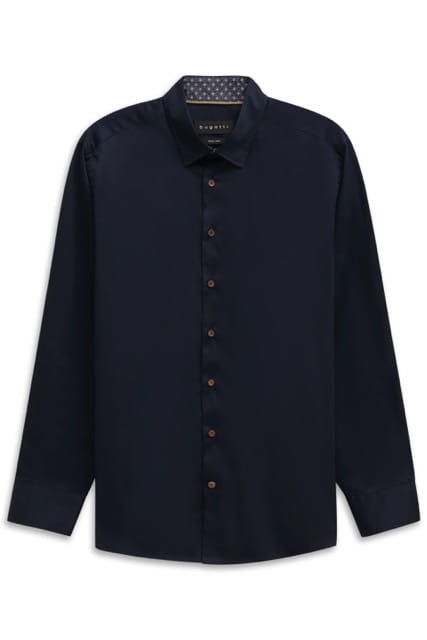 Koszula męska bugatti w kolorze granatowym, prezentująca elegancki i nowoczesny design. Posiada nowoczesny krój Modern Fit z długimi rękawami oraz kołnierzykiem, co czyni ją idealnym wyborem zarówno na formalne, jak i codzienne okazje.