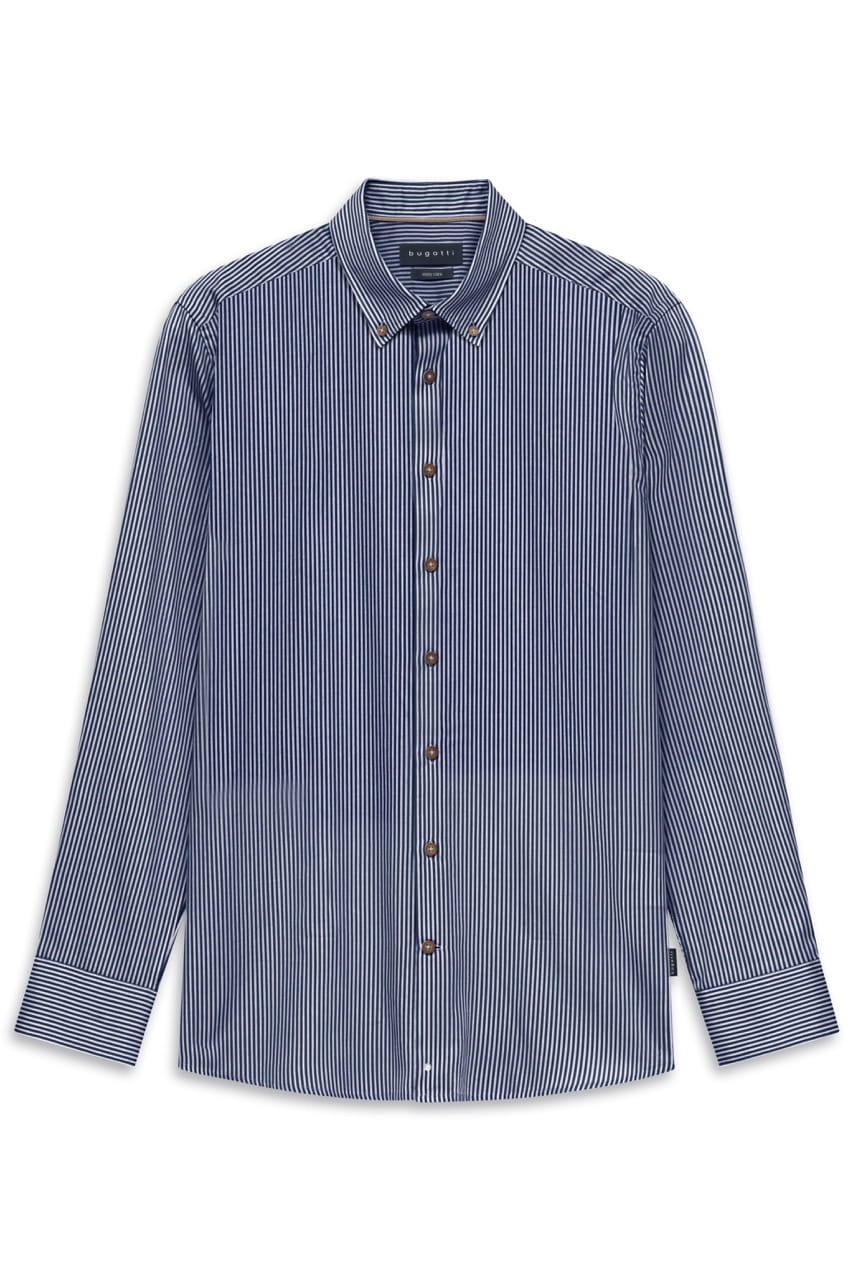 Męska koszula Bugatti to klasyczna propozycja, która łączy elegancję z codziennym komfortem noszenia. Wykonana z wysokiej jakości bawełny, zapewnia przewiewność, miękkość i wygodę przez cały dzień. Subtelny wzór w paski nadaje koszuli ponadczasowego charakteru, idealnego zarówno do stylizacji biznesowych, jak i casualowych. Klasyczny kołnierzyk zapinany na guziki oraz staranne wykończenie podkreślają dbałość o detale typową dla marki Bugatti.