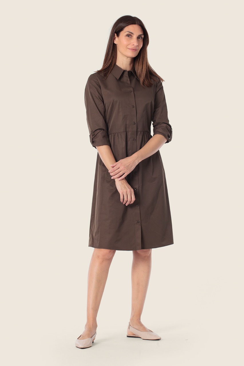 Model posiada klasyczny kołnierzyk koszulowy oraz zapięcie na guziki na całej długości, co nadaje sukience eleganckiego charakteru. Rękawy o długości 3/4 z możliwością podpięcia zwiększają funkcjonalność i pozwalają dopasować model do różnych stylizacji. W talii znajduje się delikatne marszczenie, które subtelnie podkreśla sylwetkę i nadaje sukience kobiecego kształtu.