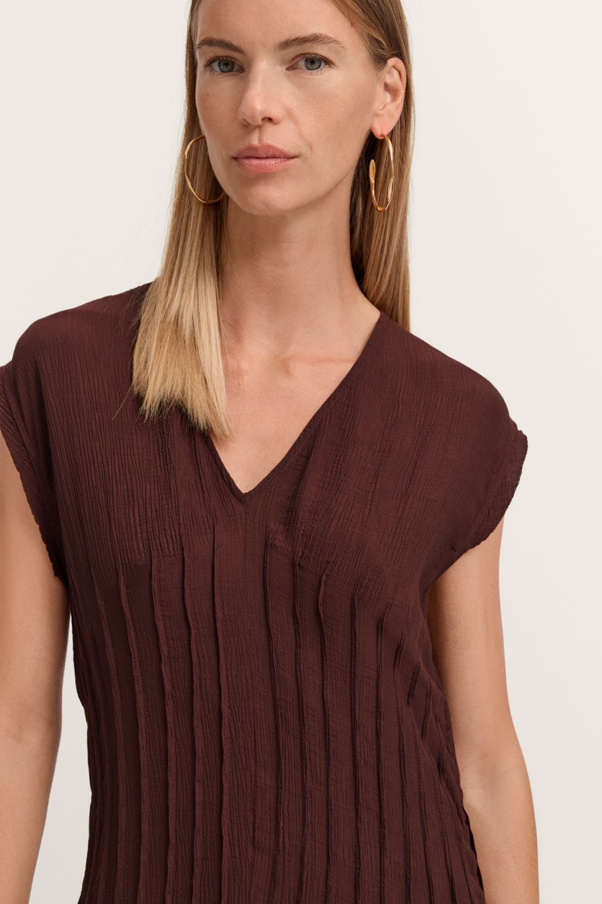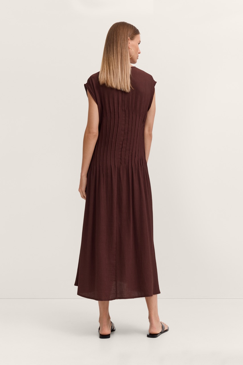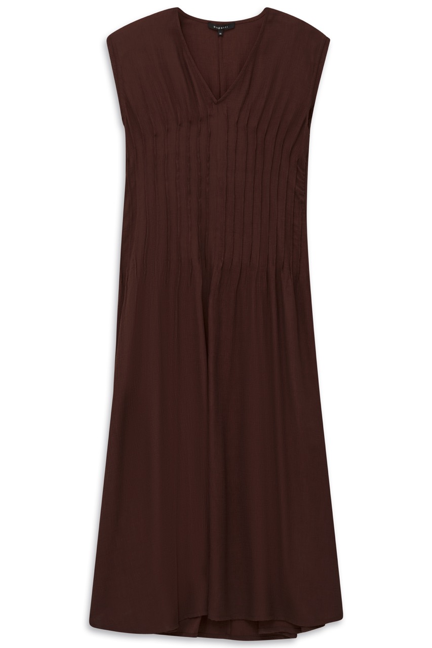 Sukienka damska bugatti w głębokim, bordowym/brązowym odcieniu to elegancka i wygodna propozycja na co dzień i specjalne okazje. Model o luźnym, rozkloszowanym kroju pięknie układa się na sylwetce i zapewnia swobodę ruchów. Subtelne marszczenia w górnej części dodają całości lekkości i kobiecego charakteru. Krótkie rękawy i dekolt w kształcie litery V podkreślają jej nowoczesny styl. Wykonana z lekkiej, przewiewnej tkaniny, idealnie sprawdzi się w cieplejsze dni. To uniwersalna sukienka, która świetnie pasuje zarówno do casualowych, jak i bardziej eleganckich stylizacji.