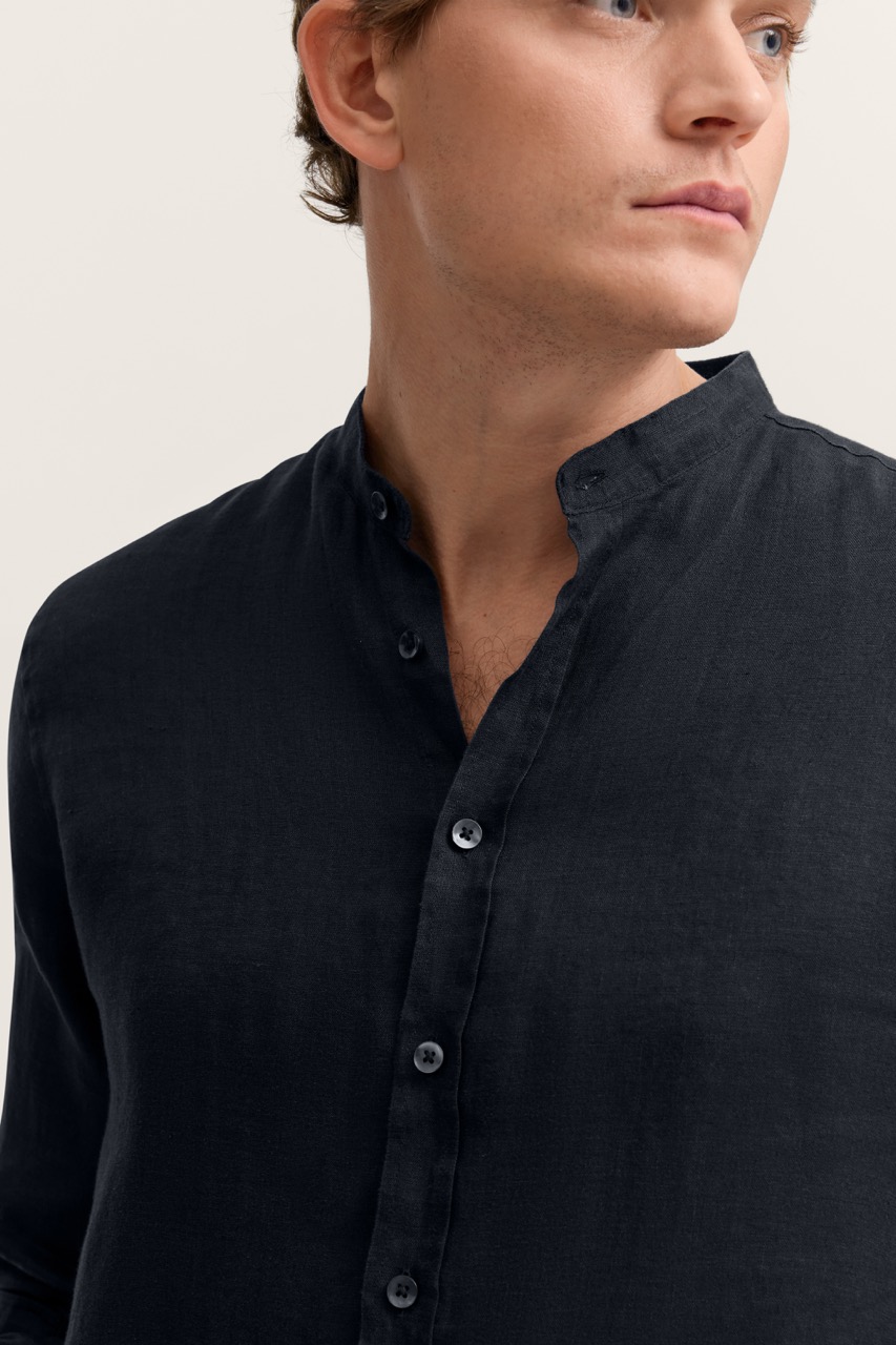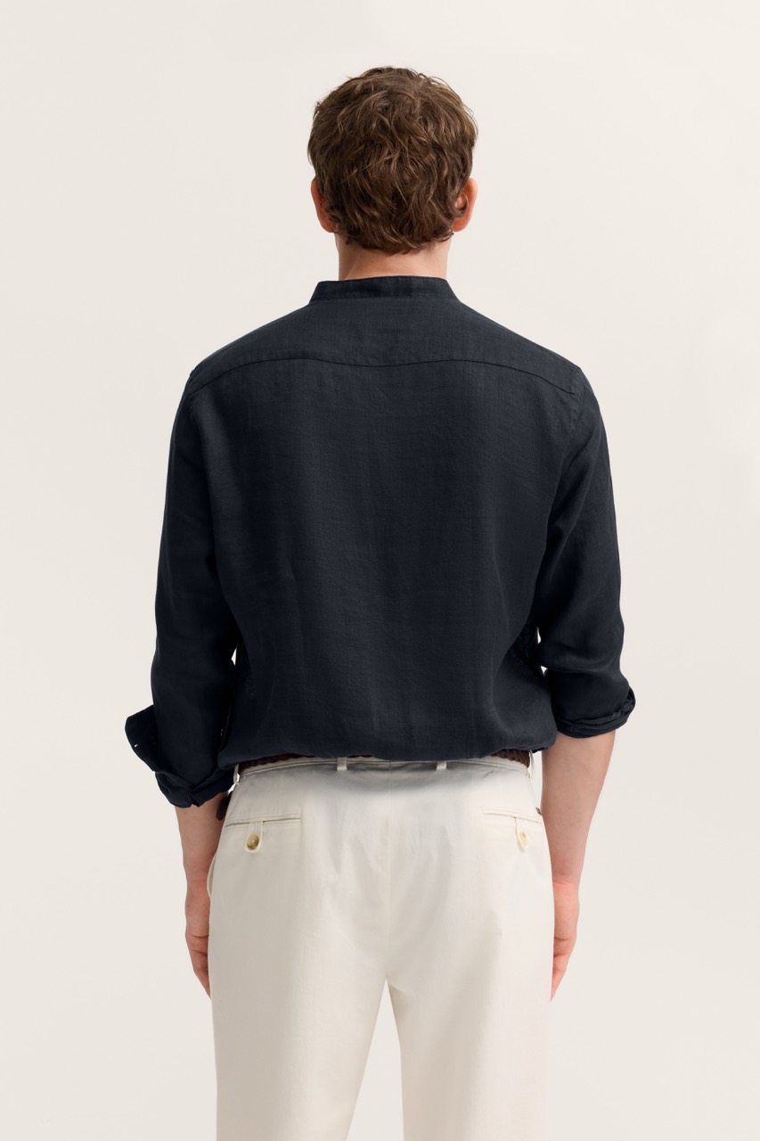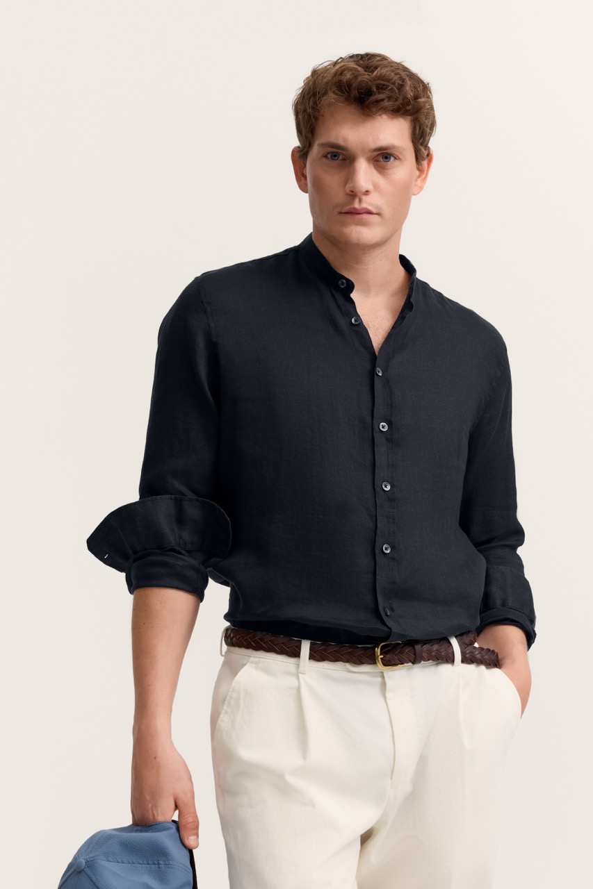 Męska lniana koszula w granatowym kolorze to elegancka i ponadczasowa propozycja na wiosenne oraz letnie stylizacje. Wykonana z naturalnego, przewiewnego lnu zapewnia doskonałą cyrkulację powietrza i wysoki komfort noszenia nawet w cieplejsze dni. Model ze stójką zamiast klasycznego kołnierzyka nadaje całości nowoczesnego, lekko casualowego charakteru, a zapięcie na guziki podkreśla jego uniwersalny styl. Długi rękaw z możliwością podwinięcia sprawia, że koszula świetnie sprawdza się zarówno na co dzień, jak i podczas bardziej eleganckich okazji. Granatowy kolor doskonale komponuje się z jasnymi spodniami chino, lnianymi szortami czy jeansami, tworząc stylowe i modne zestawienia. To idealny wybór dla mężczyzn ceniących komfort, naturalne tkaniny i klasę w nowoczesnym wydaniu.