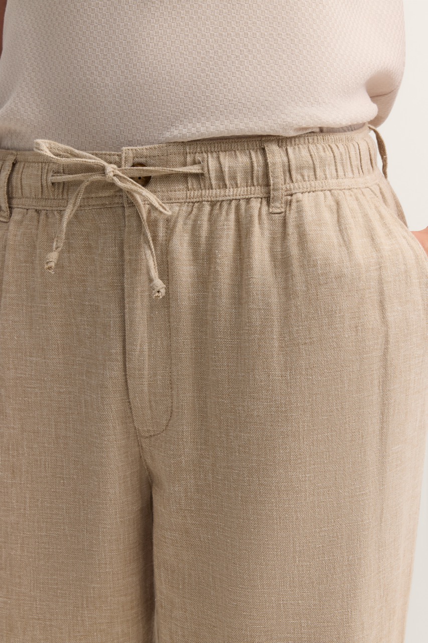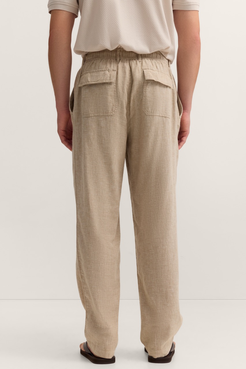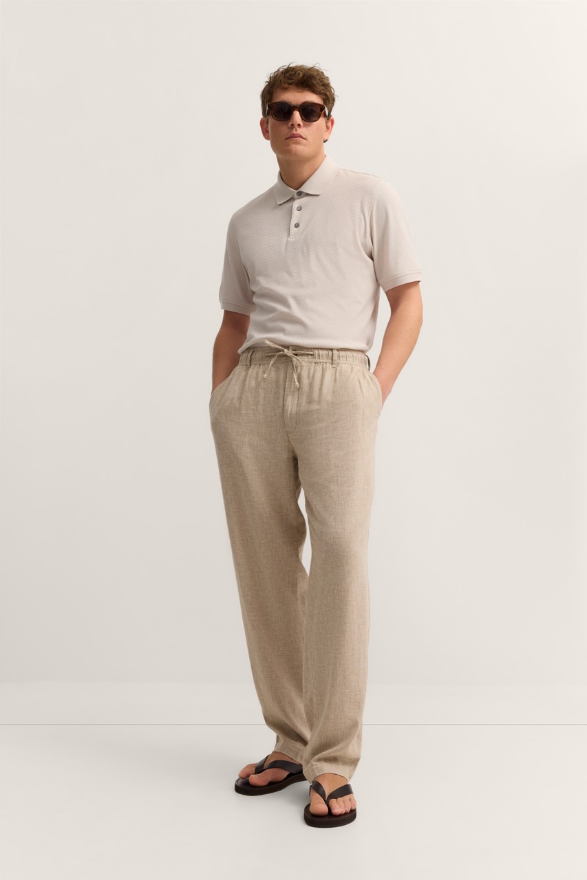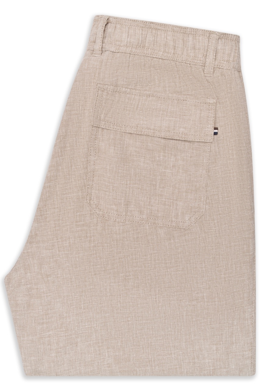 Męskie lniane spodnie Bugatti w beżowym kolorze to idealna propozycja na ciepłe dni, łącząca elegancję z maksymalnym komfortem noszenia. Wykonane z lekkiej, przewiewnej tkaniny z dodatkiem lnu zapewniają doskonałą cyrkulację powietrza i wygodę nawet podczas upalnej pogody. Model z elastycznym pasem oraz praktycznym troczkiem w talii gwarantuje idealne dopasowanie i swobodny, nowoczesny wygląd. Prosty fason z długą nogawką oraz bocznymi kieszeniami sprawia, że spodnie świetnie sprawdzają się zarówno w codziennych stylizacjach, jak i podczas letnich wyjazdów czy bardziej eleganckich okazji. Neutralny beżowy odcień doskonale komponuje się z lnianą koszulą, polo lub klasycznym T-shirtem, tworząc ponadczasowe zestawienia. To doskonały wybór dla mężczyzn ceniących naturalne materiały, styl i wygodę w nowoczesnym wydaniu.