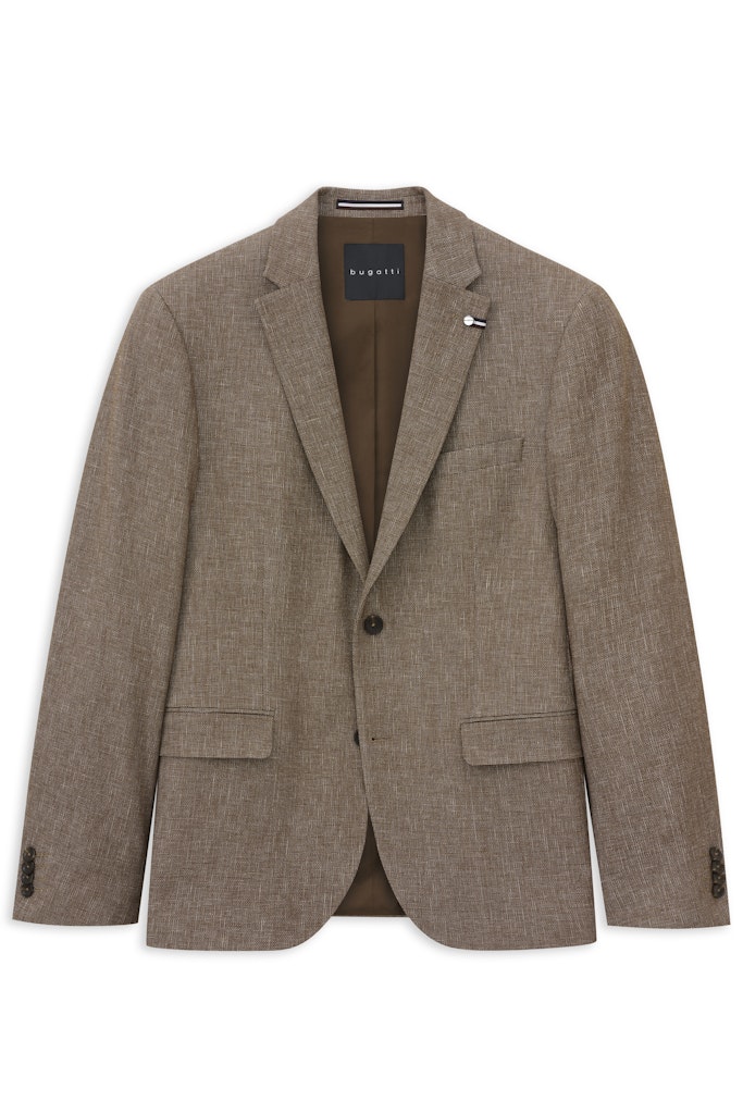 Męska marynarka Bugatti z lnem to elegancka propozycja idealna do stylizacji smart casual i półformalnych. Wykonana z wysokiej jakości tkaniny o subtelnym, drobnym wzorze, nadaje całości lekkości i nowoczesnego charakteru. Klasyczny krój z jednorzędowym zapięciem na guziki zapewnia dobre dopasowanie i komfort noszenia. Starannie wykończone detale, takie jak kieszenie z patkami i ozdobne guziki przy mankietach, podkreślają jakość wykonania. Marynarka świetnie komponuje się zarówno z koszulą i chinosami, jak i z jeansami. To uniwersalna marynarka męska Bugatti dla mężczyzn ceniących styl, elegancję i wygodę na co dzień.