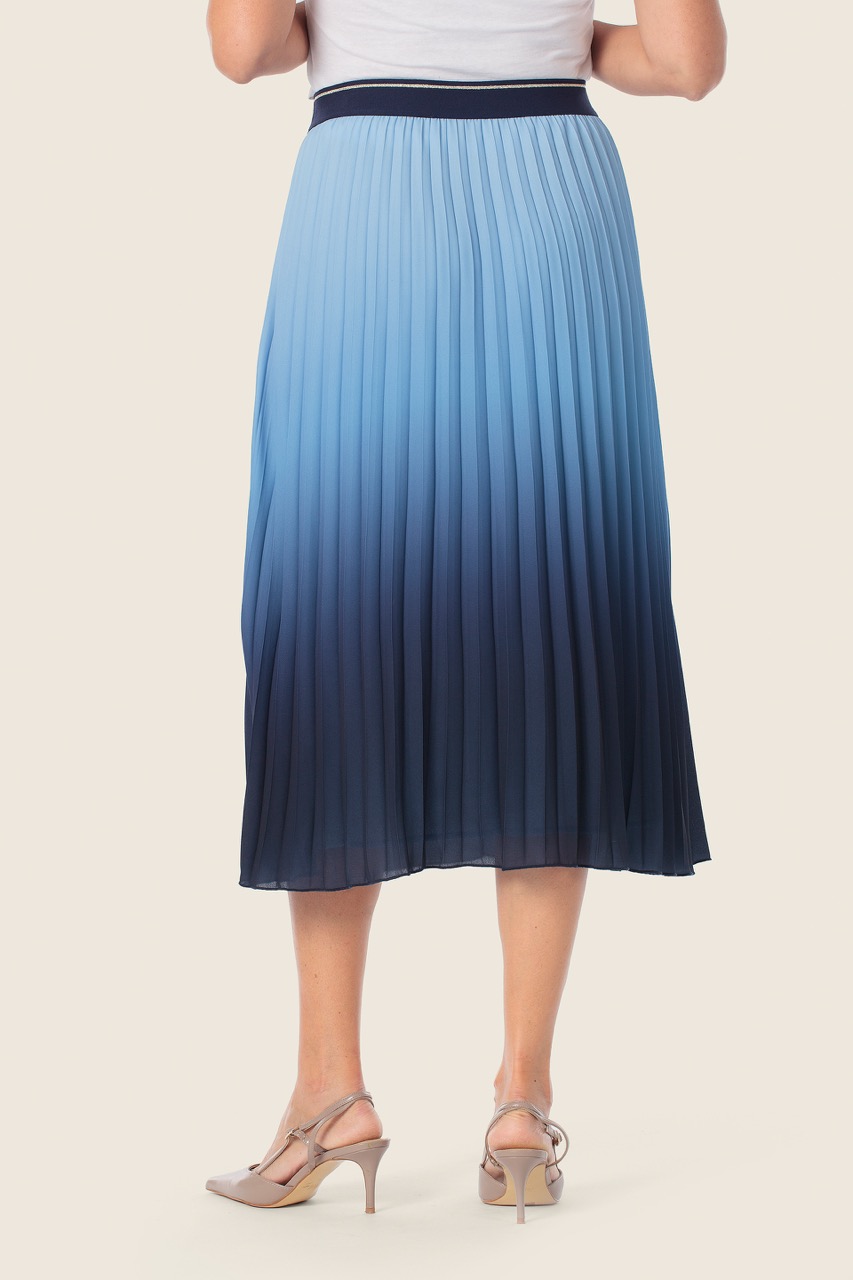 Najbardziej charakterystycznym elementem modelu jest efekt cieniowania (ombre). Kolor przechodzi płynnie od jasnego błękitu w górnej części do głębokiego granatu u dołu, tworząc elegancki i nowoczesny efekt wizualny. Dzięki tej kolorystyce spódnica świetnie komponuje się z jasnymi bluzkami, koszulami lub prostymi topami, tworząc eleganckie stylizacje na różne okazje.