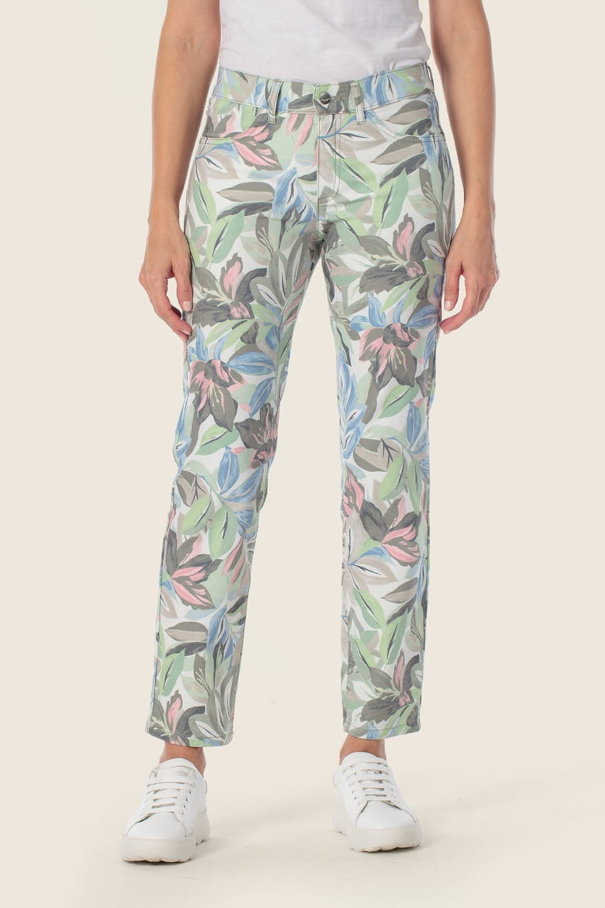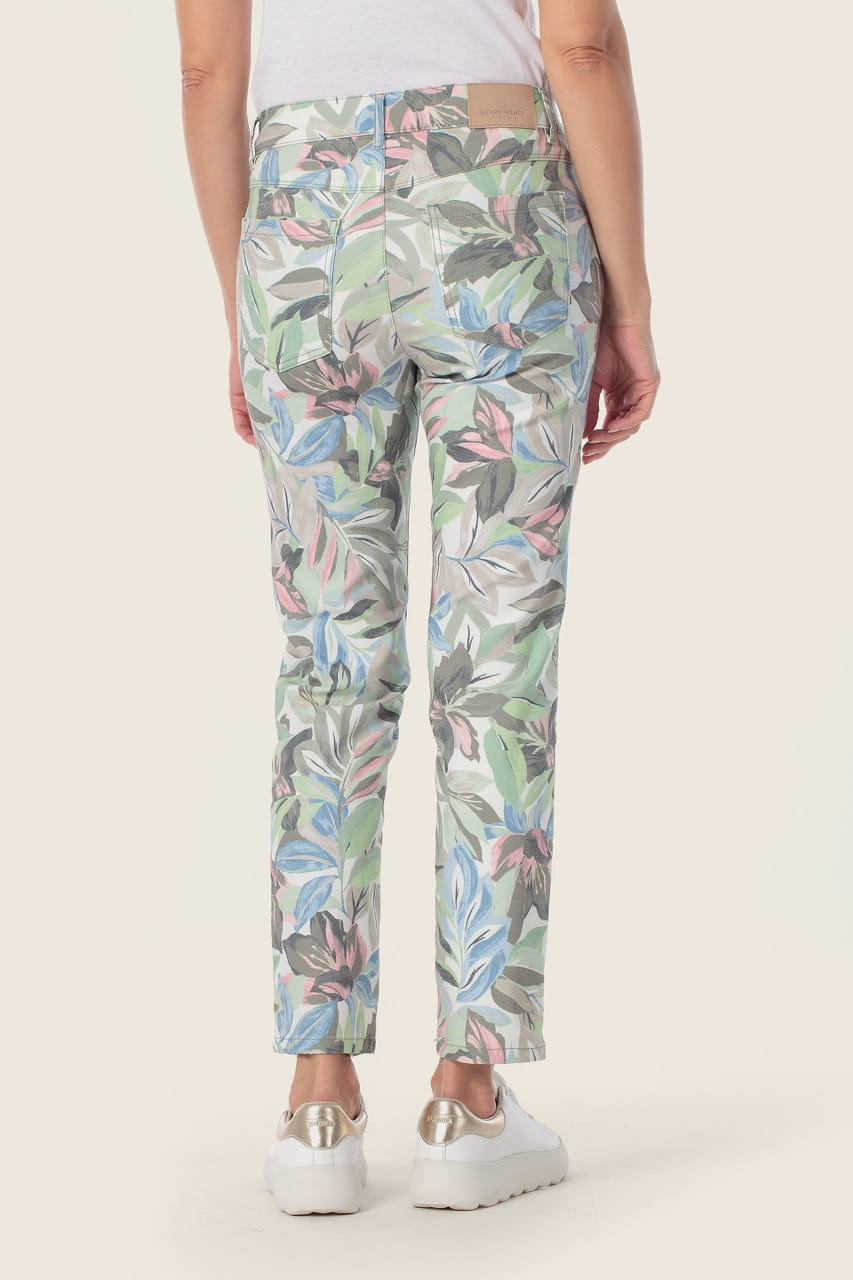 Wzorzyste spodnie damskie Gerry Weber to propozycja dla kobiet, które lubią dodać stylizacji świeżości i koloru. Efektowny, roślinny print w odcieniach zieleni, błękitu i różu przyciąga uwagę, a jednocześnie pozostaje subtelny i elegancki.