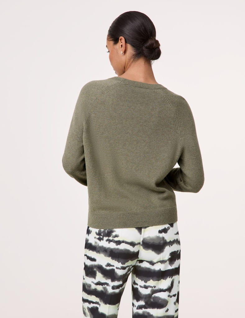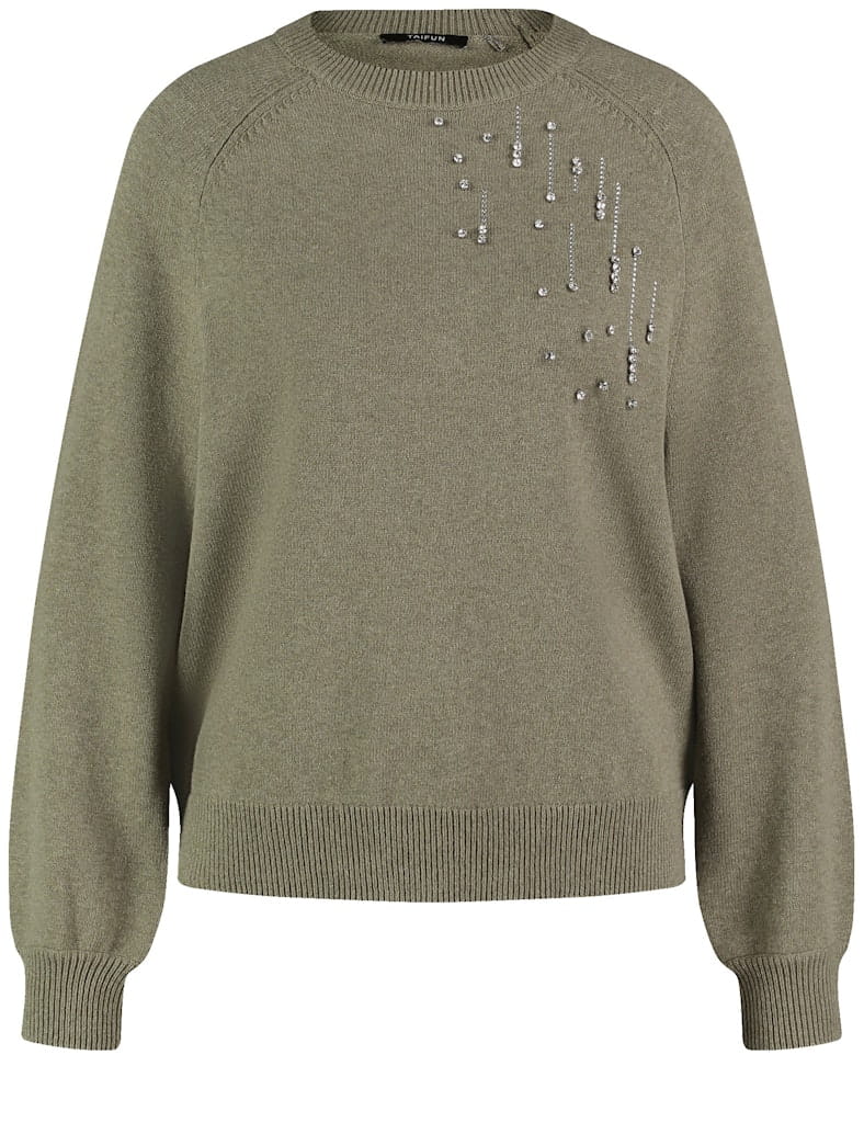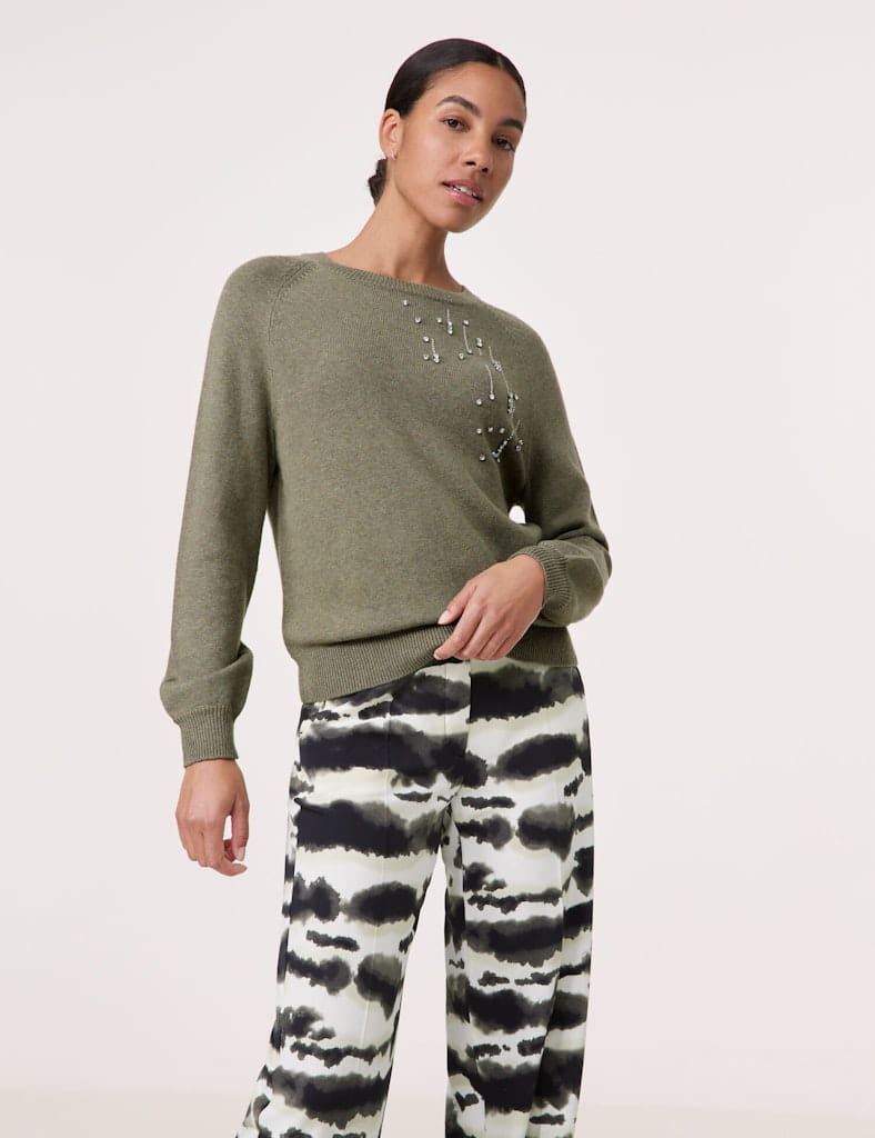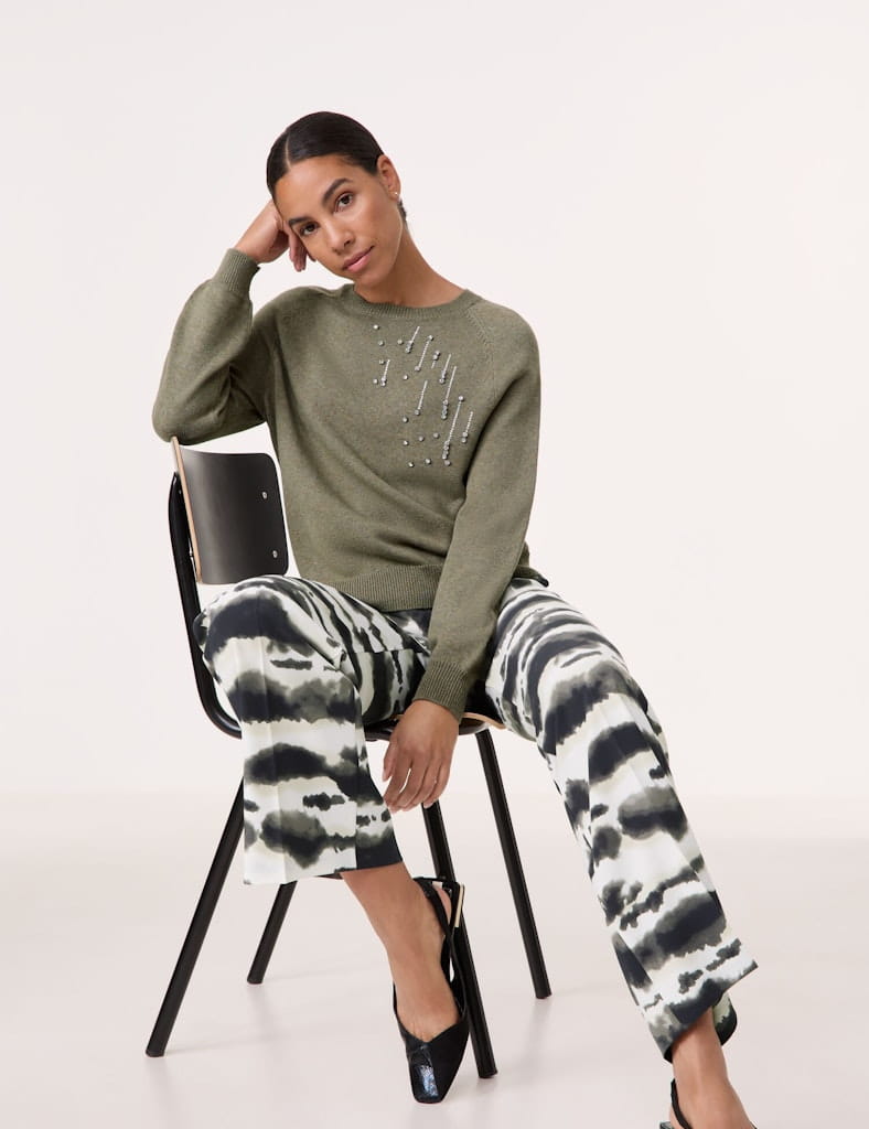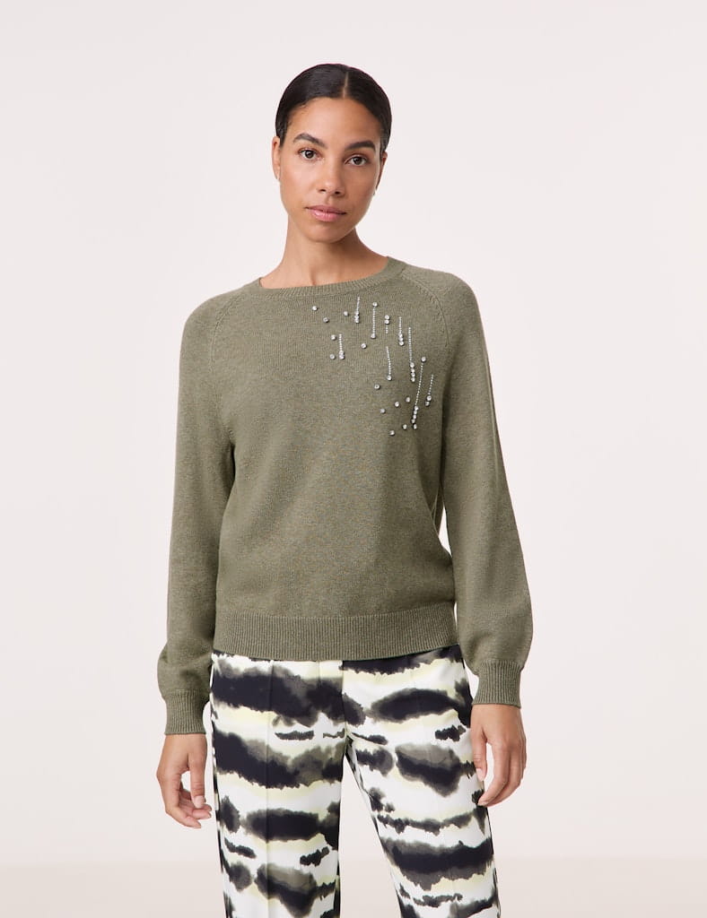 Odmień swoje stylizacje dzięki naszemu czarującemu swetrowi, który emanuje odrobiną magii dzięki aplikacjom z kryształków. Wykonany z wysokiej jakości cienkiej dzianiny z zawartością rozgrzewającej wełny, gwarantuje nie tylko stylową subtelność, ale także przytulny komfort. Niezbędnik dla każdego, kto chciałby połączyć styl glamour z wygodą.