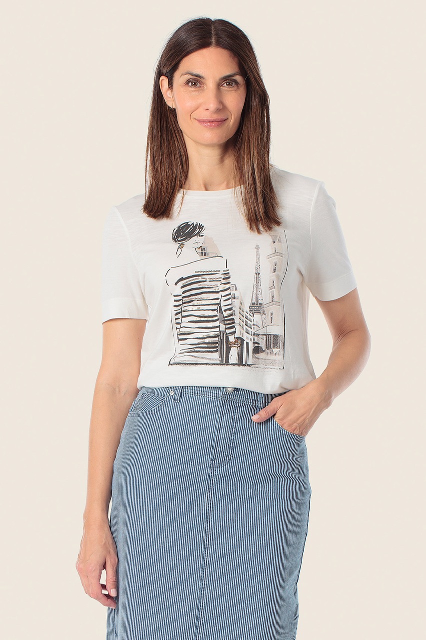 Damski T-shirt Gerry Weber to stylowa propozycja inspirowana paryskim klimatem i miejską elegancją. Model wyróżnia się dekoracyjnym nadrukiem przedstawiającym kobiecą sylwetkę na tle architektury Paryża, co nadaje koszulce modowego, artystycznego charakteru.