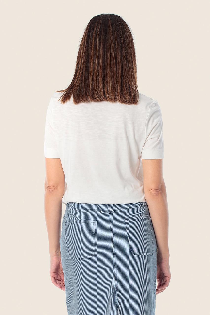 Koszulka posiada klasyczny, okrągły dekolt oraz krótki rękaw, dzięki czemu jest wygodna i uniwersalna w codziennym noszeniu. Prosty fason sprawia, że model dobrze układa się na sylwetce i świetnie komponuje się zarówno ze spodniami, jak i spódnicami.