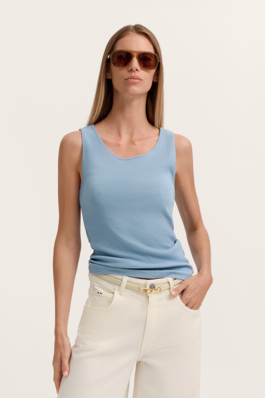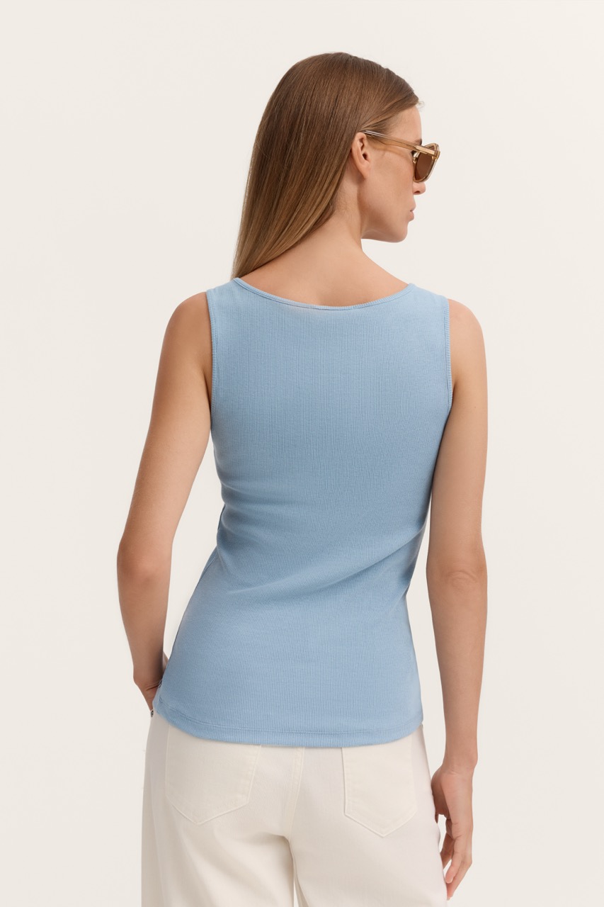 Top damski bugatti to minimalistyczna i uniwersalna propozycja na ciepłe dni, która świetnie wpisuje się w nowoczesne, casualowe stylizacje. Model ma prosty, dopasowany fason oraz okrągły dekolt, który subtelnie podkreśla linię ramion i szyi. Szerokie ramiączka zapewniają komfort noszenia i sprawiają, że top dobrze układa się na sylwetce. Wykonany jest z miękkiej, elastycznej dzianiny o delikatnej prążkowanej strukturze, dzięki czemu idealnie dopasowuje się do ciała i jest bardzo wygodny na co dzień. Materiał jest przyjemny w dotyku i przewiewny, co czyni go idealnym wyborem na lato. Kolor jasnego błękitu nadaje stylizacji świeżości i lekkości, a jednocześnie łatwo łączy się z neutralnymi barwami, takimi jak biel, beż czy denim.