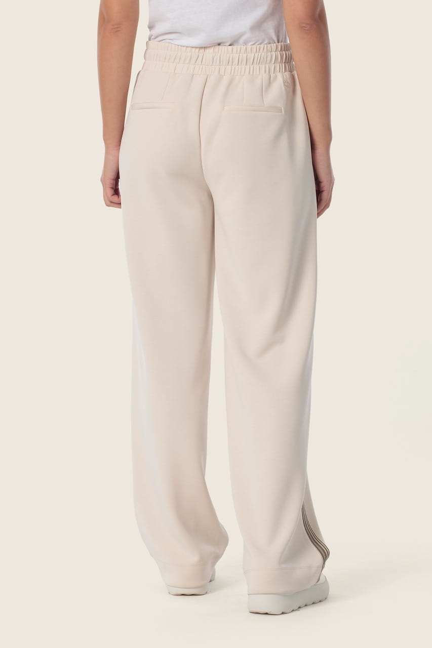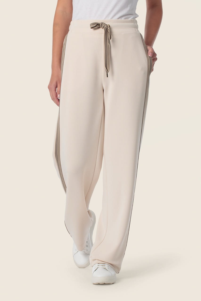 Spodnie posiadają elastyczny pas z wiązaniem, dzięki czemu doskonale dopasowują się do figury i zapewniają maksymalną wygodę przez cały dzień. Luźniejsza nogawka o prostym kroju pięknie układa się w ruchu, a miękka, przyjemna w dotyku tkanina sprawia, że model świetnie sprawdzi się zarówno w casualowych stylizacjach, jak i w bardziej eleganckim wydaniu z marynarką i sneakersami.